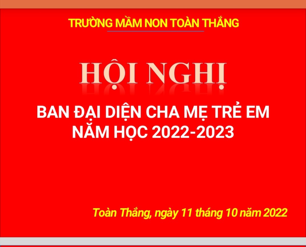 Trường Mầm non Toàn Thắng tổ chức cuộc họp BĐDCMTE toàn trường đầu năm học 2022- 2023. Tới dự cuộc họp có: Ban chấp hành Hội CMTE nhà trường, đại diện cha mẹ trẻ em 9 lớp, Ban giám hiệu và 9 giáo viên của 9 lớp.
