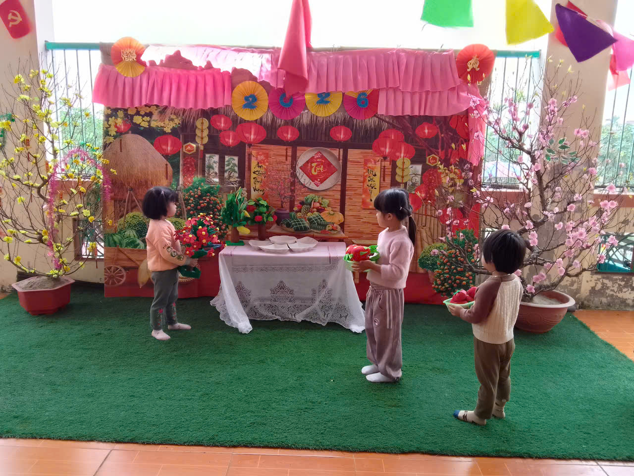 Trong không khí rộn ràng đón Tết Nguyên đán, cô và trẻ cùng chuẩn bị hoa quả, sắp xếp bánh chưng gói đón Tết. Trẻ được quan sát, nhận biết các loại hoa quả quen thuộc và bánh chưng ngày Tết. Dưới sự hướng dẫn của cô, trẻ tham gia bày biện mâm Tết gọn gàng, ngăn nắp. Hoạt động giúp trẻ cảm nhận nét đẹp truyền thống của ngày Tết cổ truyền. Trẻ được rèn luyện sự khéo léo, cẩn thận và tinh thần hợp tác với bạn bè. Qua hoạt động, trẻ mạnh dạn giao tiếp, chia sẻ niềm vui cùng cô và các bạn. Trẻ thêm yêu không khí Tết, biết trân trọng giá trị văn hóa dân tộc và mong đón một mùa xuân vui tươi, ấm áp.