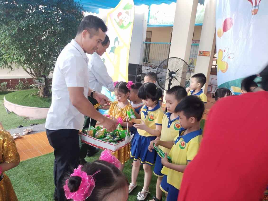 Ông Phạm Văn Chức - CT Hội CMTE nhà trường tặng quà cho cô và các cháu