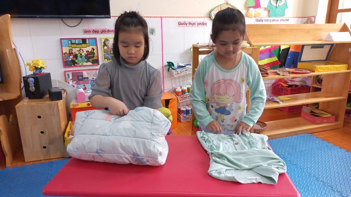 có thể làm được. Ví dụ: Tự múc ăn, tự đánh răng, tự mặc quần áo, cất đồ chơi...