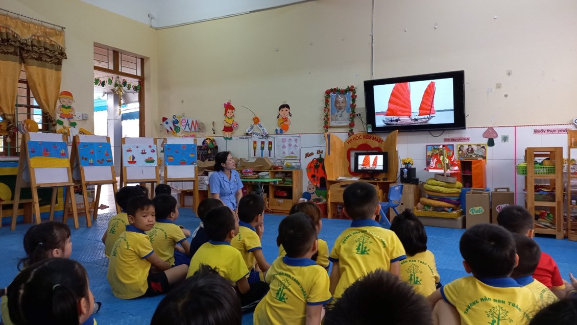 Trong chủ đề: " Phương tiện và luật lệ giao thông" để phát huy tính sáng tạo của trẻ các cô giáo đã xây dựng hoạt động: "xé dán thuyền trên biển" nhằm phát triển khĩ năng tạo hình, sự khéo léo của đôi bàn tay của trẻ thông qua hoạt động xé dán những chiếc thuyền.