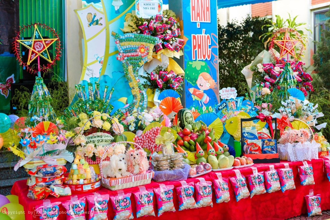 , ngay từ sớm ở cổng trường, cô giáo cùng với chị Hằng Nga và chú Cuội đã chờ sẵn để chào đón các bé, ân cần đưa các con vào trường. Trong từng lớp học, cô giáo và các con được sự hỗ trợ của bố mẹ đã trang trí lớp học bằng những chiếc đèn lồng xinh xắn, dây treo xúc xích, kết bóng, cờ, hoa hay tạo hình những chiếc mặt nạ ngộ nghĩnh, lớp nào cũng bày cỗ thật đẹp để chuẩn bị phá cỗ Trung thu.