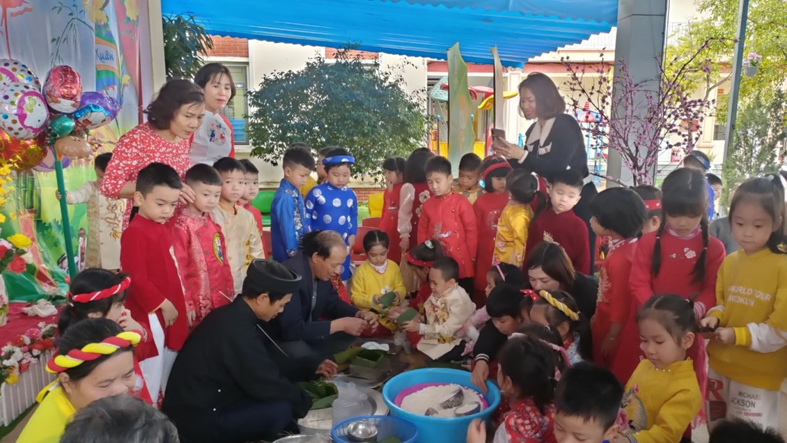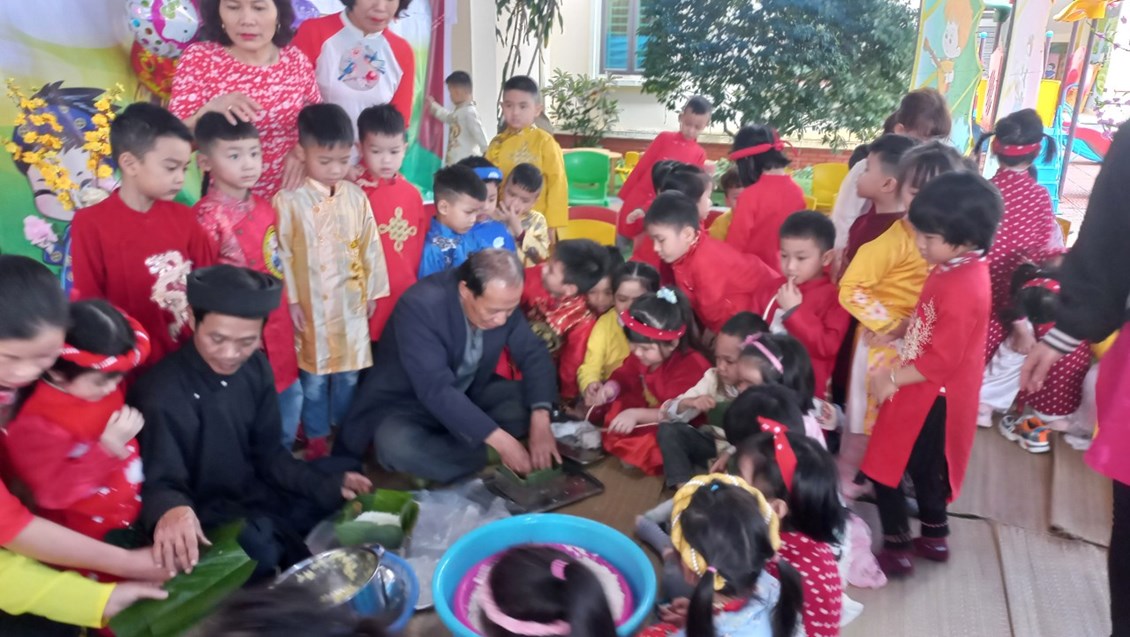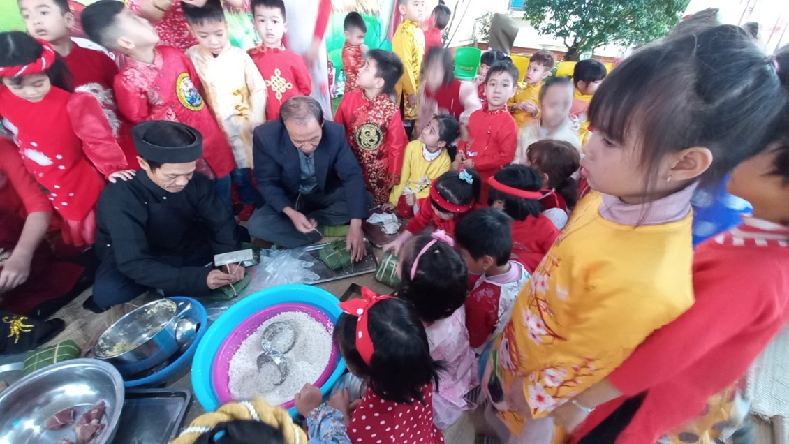 động trải nghiệm thực tiễn với phong tục gói bánh chưng ngày Tết. Tham gia vào