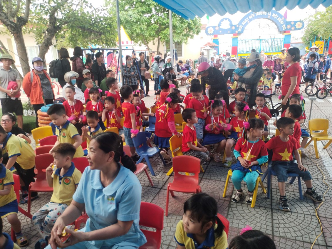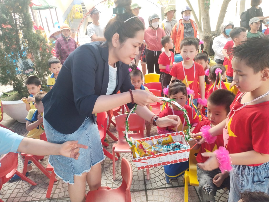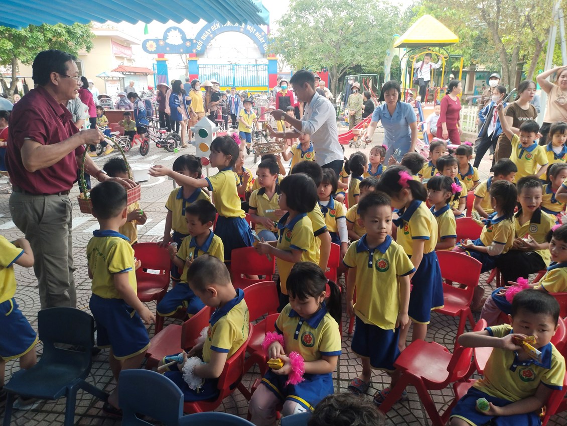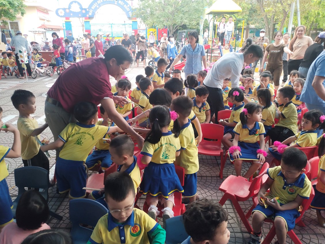 Các cô bác đại diện PHHS chia quà cho các cháu