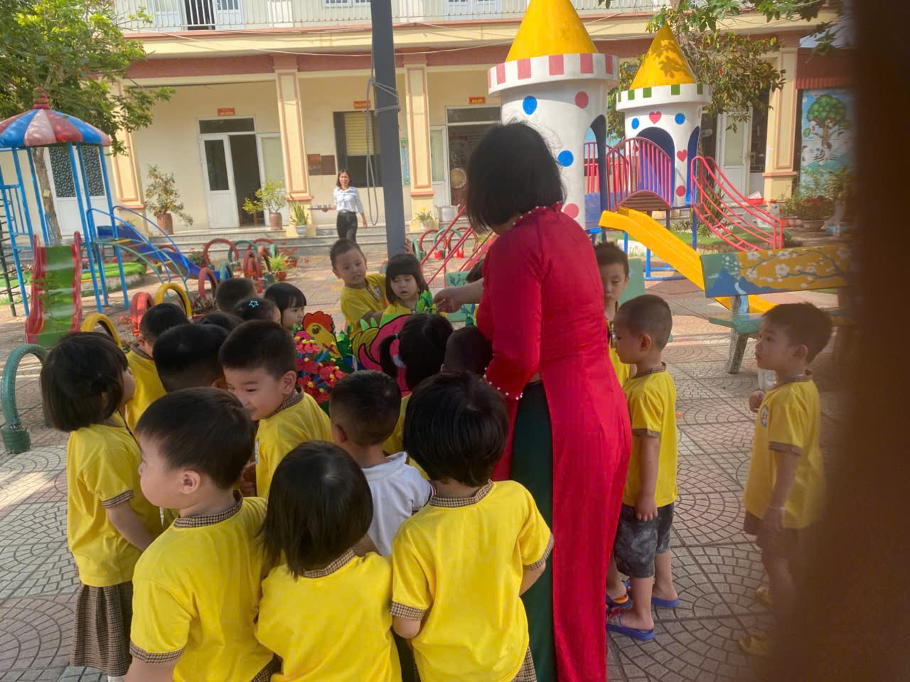 “Tìm hiểu một số con vật sống trong gia đình” được tổ chức ngoài trời nhằm tạo môi trường học tập gần gũi, sinh động và kích thích sự tò mò của trẻ 3–4 tuổi. Trong không gian thoáng đãng, trẻ được quan sát trực tiếp hoặc qua hình ảnh các con vật quen thuộc như gà, vịt, chó, mèo… giúp việc tiếp nhận kiến thức trở nên tự nhiên và hấp dẫn hơn. Cô giáo khéo léo gợi mở bằng các câu hỏi đơn giản như “Con gì biết gáy?”, “Con gì giữ nhà?”, từ đó dẫn dắt trẻ gọi tên, nhận biết đặc điểm nổi bật và lợi ích của từng con vật. Trẻ được khuyến khích chia sẻ hiểu biết của mình, kể về những con vật nuôi ở nhà, giúp phát triển ngôn ngữ và sự tự tin trong giao tiếp. Trong quá trình hoạt động, cô kết hợp cho trẻ bắt chước tiếng kêu, dáng đi của các con vật, tạo không khí vui tươi, giúp trẻ ghi nhớ lâu hơn. Bên cạnh đó, giáo dục trẻ biết yêu quý, chăm sóc và bảo vệ các con vật nuôi trong gia đình, không trêu chọc hay làm đau chúng. Hoạt động ngoài trời còn giúp trẻ rèn luyện sức khỏe, tăng khả năng quan sát và tương tác với môi trường xung quanh. Cuối giờ, cô tổ chức trò chơi nhẹ nhàng để củng cố kiến thức, giúp trẻ khắc sâu nội dung đã học. Tiết học không chỉ mang lại niềm vui mà còn góp phần hình thành ở trẻ tình yêu thiên nhiên và ý thức bảo vệ vật nuôi gần gũi trong cuộc sống hằng ngày.
