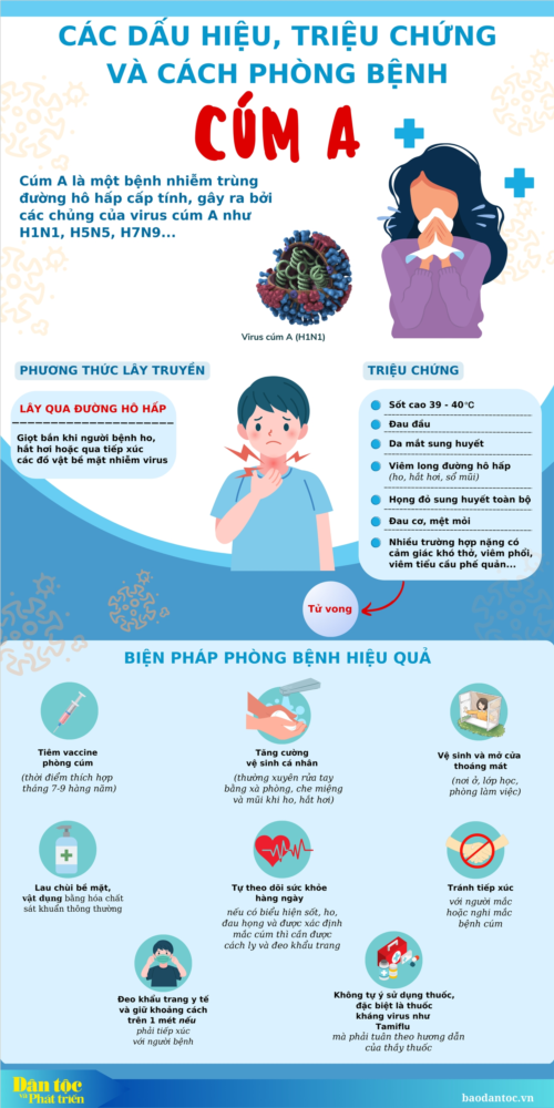 Cúm A là một bệnh nhiễm trùng đường hô hấp cấp tính thường xảy ra vào các thời điểm giao mùa. Các triệu chứng của bệnh gồm sốt cao (phổ biến ở trẻ dưới 2 tuổi), nhức đầu, mỏi cơ, đau họng, ho, mệt mỏi, sổ mũi, hắt hơi nhiều, nôn trớ,…. Với những triệu chứng này, bệnh dễ bị nhầm lẫn với cảm thông thường nhưng chuyển biến của bệnh cúm A thường diễn ra rất nhanh với các triệu chứng nghiêm trọng như bỏ ăn, thở nhanh, ngủ li bì, mất nhận thức, chân lạnh, sốt cao co giật,…. Khi không phát hiện và xử lý đúng cách, bệnh có thể gây ra nhiều biến chứng nguy hiểm, thậm chí gây tử vong. Đặc biệt ở trẻ nhỏ, hệ miễn dịch của trẻ còn non yếu, bố mẹ cần chủ động thực hiện tốt các biện pháp phòng ngừa cúm A cho trẻ. (1)