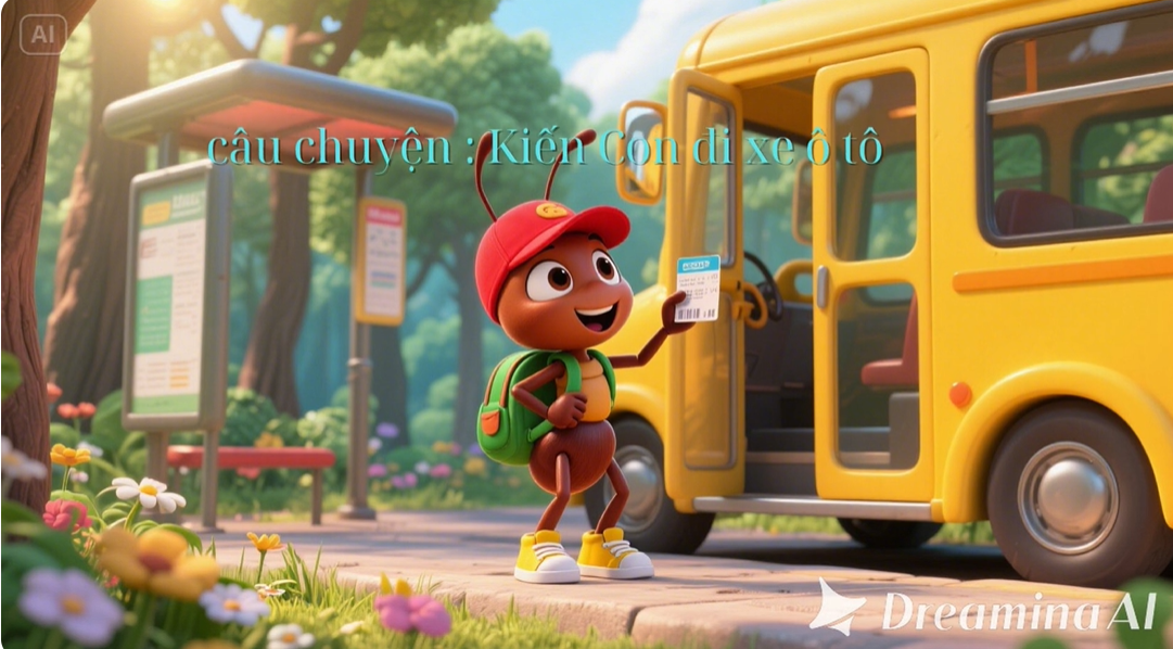 Kiến con leo lên xe buýt. Kiến muốn vào rừng xanh thăm bà ngọai. Trên xe đã có dê con.Chó con, khỉ con, lợn con ngồi. Có bạn trong bọn họ vào rừng hái nấm, có bạn vào rừng chơi trốn tìm, có bạn đến dạo chơi bên hồ ở trong rừng.