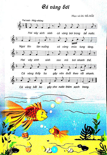Bài hát “Cá vàng bơi” nói lên vẻ đẹp của chú cá vàng đang bơi, cá vàng đi bắt bọ gậy làm cho nguồn nước luôn trong và sạch để bảo vệ môi trường của chúng ta.