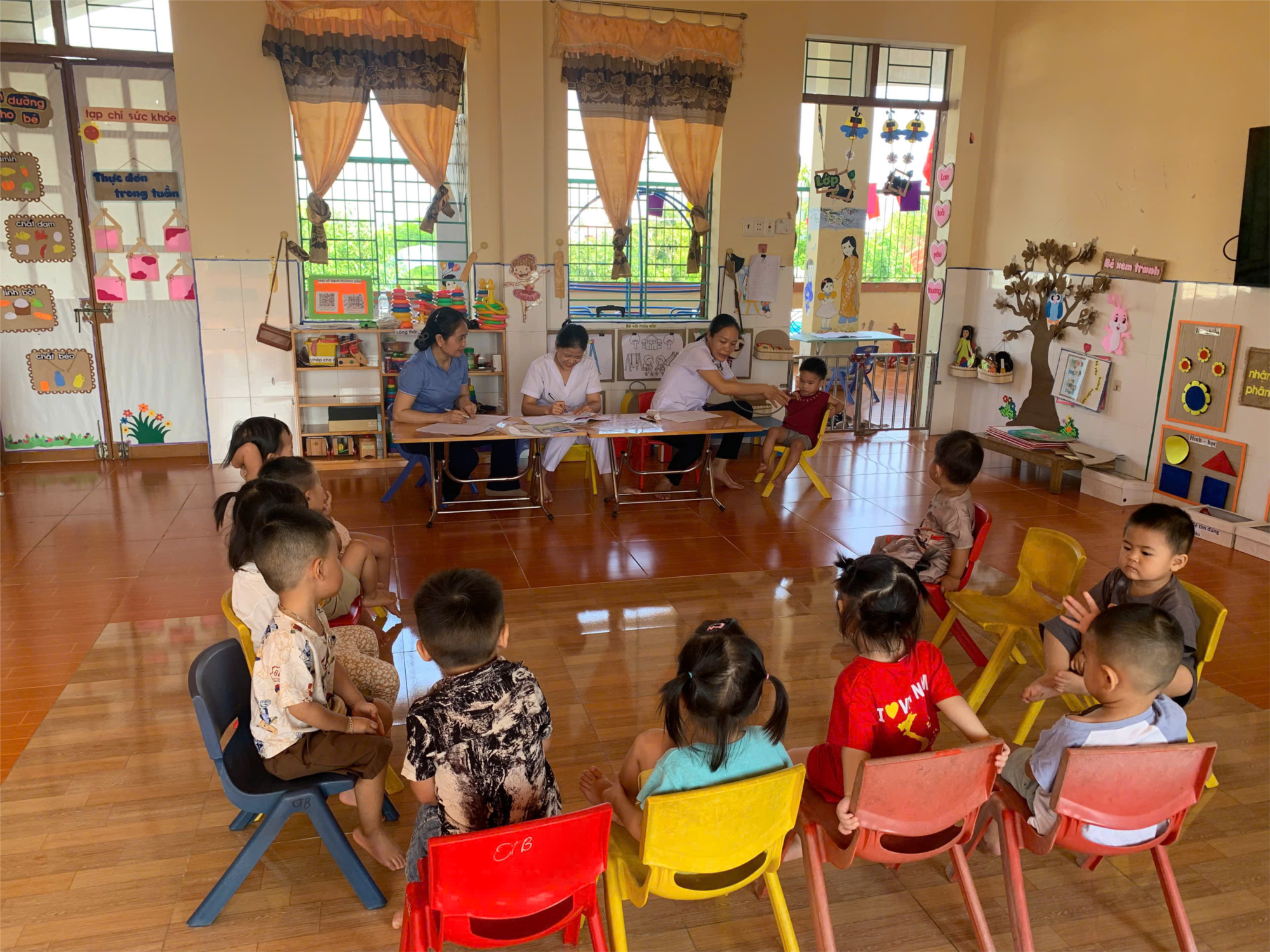 Sáng ngày 23/9/2025, các bé lớp CTA đón các cô trong đoàn trạm y tế xã Tiên Minh đến khám sức khỏe lần 1 trong năm học 2025 - 2026. Khám sức khỏe định kỳ cho trẻ mầm non không chỉ phòng bệnh cho trẻ mọi lúc, việc tối ưu sức khỏe để trẻ có thể phát triển khỏe mạnh và toàn diện là một điều quan trọng mà phụ huynh cần lưu ý.