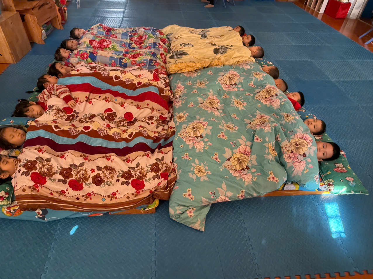 Trước hết, nhà trường và giáo viên chủ động chuẩn bị cơ sở vật chất đảm bảo ấm áp cho trẻ. Phòng học được che chắn kín gió, cửa sổ đóng khi trời lạnh, nền lớp khô ráo, sạch sẽ. Chăn, đệm, chiếu ngủ của trẻ luôn sạch sẽ, đủ ấm và được giặt phơi thường xuyên. Khi nhiệt độ xuống thấp, giáo viên cho trẻ ngủ đủ chăn, sắp xếp trẻ nằm sát nhau để giữ ấm cơ thể.