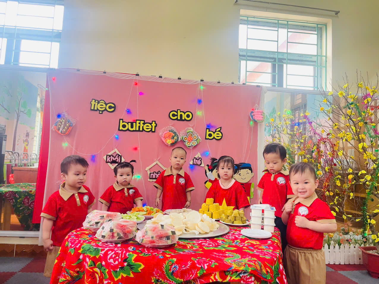 Tiệc buffet trong trường mầm non không chỉ là một bữa ăn mà còn là một hoạt động giáo dục bổ ích, giúp trẻ phát triển kỹ năng tự phục vụ, làm quen với nhiều loại thực phẩm khác nhau và học cách ăn uống lịch sự. Trẻ học cách lấy thức ăn, cầm thìa, nĩa đúng cách, rèn luyện sự khéo léo và tự lập. Buffet thường có nhiều món ăn khác nhau, giúp trẻ trải nghiệm nhiều hương vị và chất dinh dưỡng phong phú. Tạo không khí vui vẻ, kích thích ăn ngon: Hình thức buffet giúp bữa ăn trở nên sinh động, khiến trẻ hào hứng hơn với việc ăn uống.