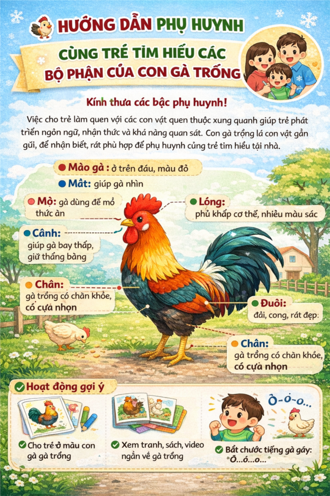 Việc cho trẻ làm quen với các con vật quen thuộc xung quanh giúp trẻ phát triển ngôn ngữ, nhận thức và khả năng quan sát. Con gà trống là con vật gần gũi, dễ nhận biết, rất phù hợp để phụ huynh cùng trẻ tìm hiểu tại nhà.
