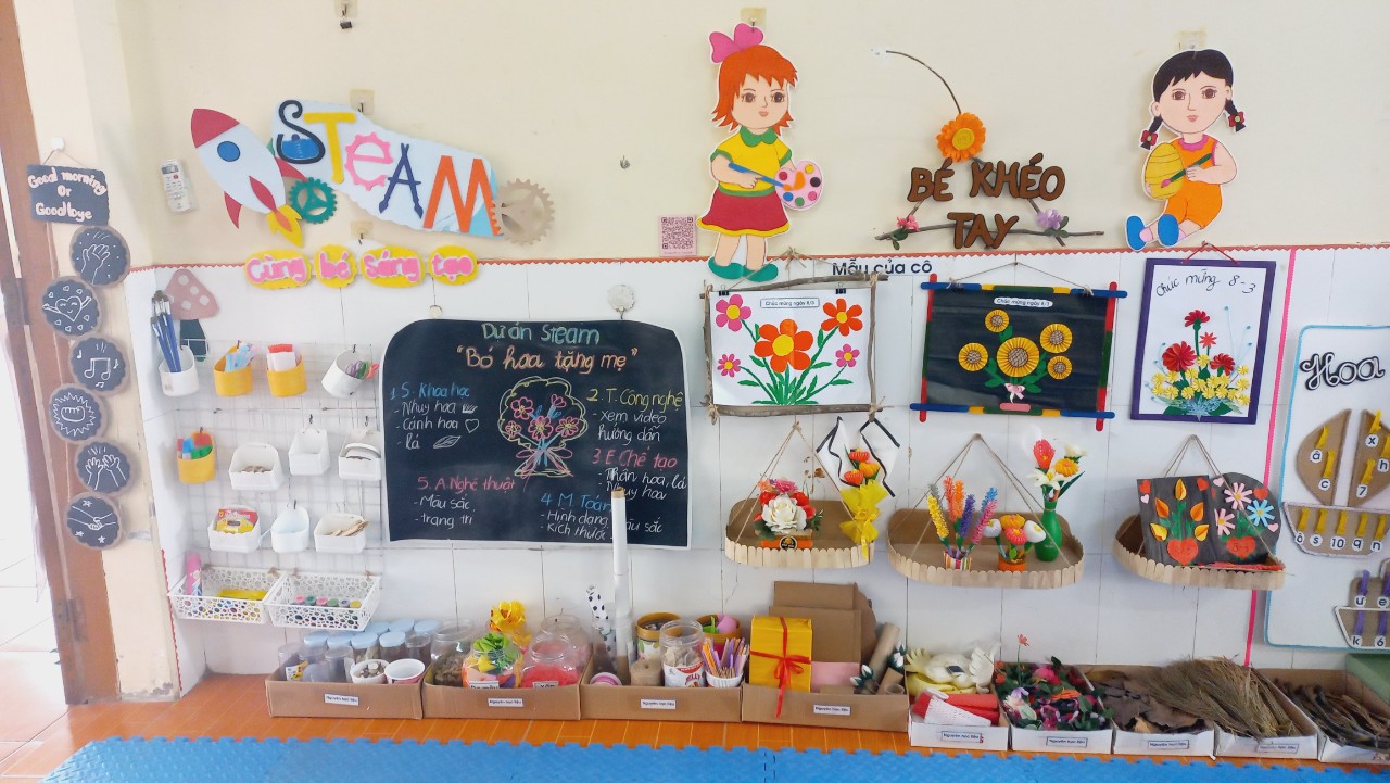 ngoài lớp. Các cô giáo cùng các bé lớp 5B cùng nhau tạo môi trường lớp học đầy