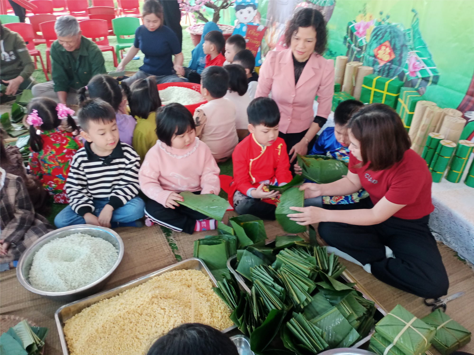 Hòa chung không khí đó, sáng ngày 05/02/ 2024, các cô giáo trường mầm non Toàn Thắng đã tổ chức một buổi trải nghiệm đặc biệt cho các bé - Gói bánh chưng. Với sự chuẩn bị chu đáo của các giáo viên các nguyên liệu như lá bánh, lạt buộc, gạo nếp, đỗ xanh, thịt lợn để làm cho mỗi trẻ một chiếc bánh chưng nhỏ xinh mang đặc trưng của ngày Tết. Đây cũng là món quà trải nghiệm thật ý nghĩa mà các cô dành tặng các con trước khi đón Tết Giáp Thìn 2024.