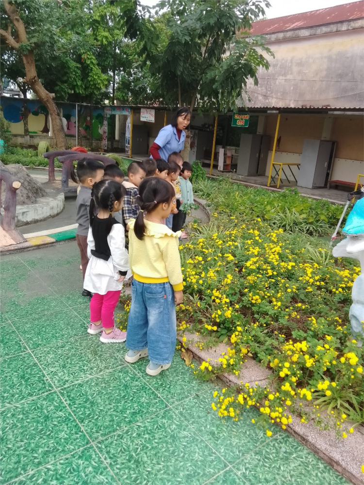 Cô cho trẻ đi thăm vườn hoa trong trường để trẻ được quan sát các loại hoa quen thuộc. Trẻ nhận biết tên gọi, màu sắc và đặc điểm nổi bật của hoa thông qua quan sát trực tiếp. Cô sử dụng phương pháp trực quan, đàm thoại gợi mở và trải nghiệm thực tế để giúp trẻ ghi nhớ kiến thức. Trẻ được trò chuyện, chỉ và gọi tên hoa mình thích. Qua hoạt động, trẻ phát triển ngôn ngữ, kỹ năng quan sát và tình yêu thiên nhiên. Giáo dục trẻ biết chăm sóc, bảo vệ cây hoa và giữ gìn môi trường xanh – sạch – đẹp.