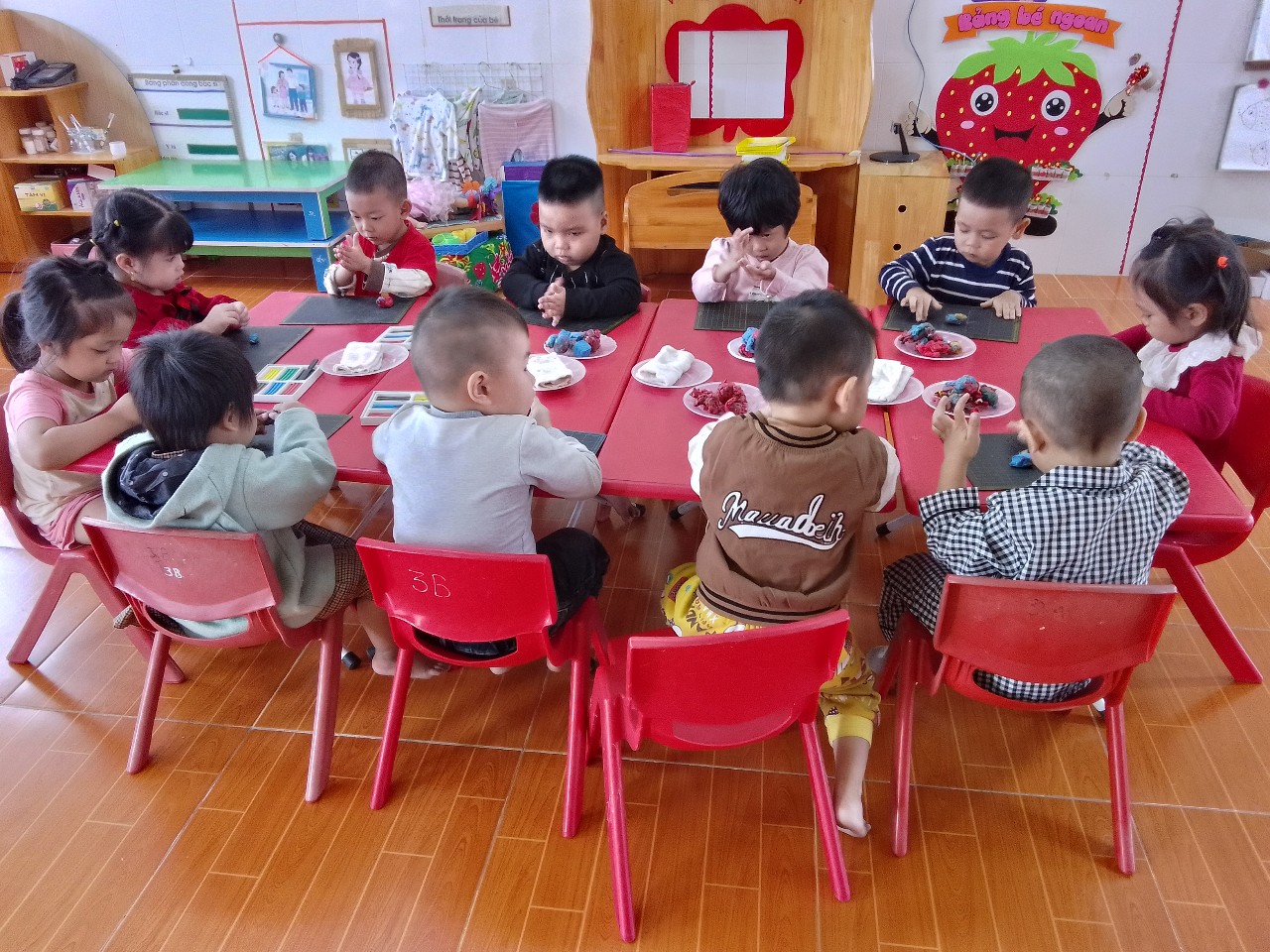 Trong giờ hoạt động tạo hình hôm nay, các bé lớp 3 tuổi B cùng nhau nặn những chiếc vòng xinh xắn tặng mẹ. Với những viên đất nặn đủ màu sắc, đôi tay nhỏ nhắn của các con đã khéo léo vo tròn, nối lại thành vòng, trang trí thêm hoa, hạt, nơ thật đẹp. Hoạt động không chỉ giúp trẻ phát triển sự khéo léo, óc sáng tạo, mà còn bồi dưỡng tình yêu thương và lòng biết ơn với mẹ. Những chiếc vòng đáng yêu chính là món quà nhỏ chứa đựng tình cảm lớn mà các bé gửi tặng mẹ yêu!