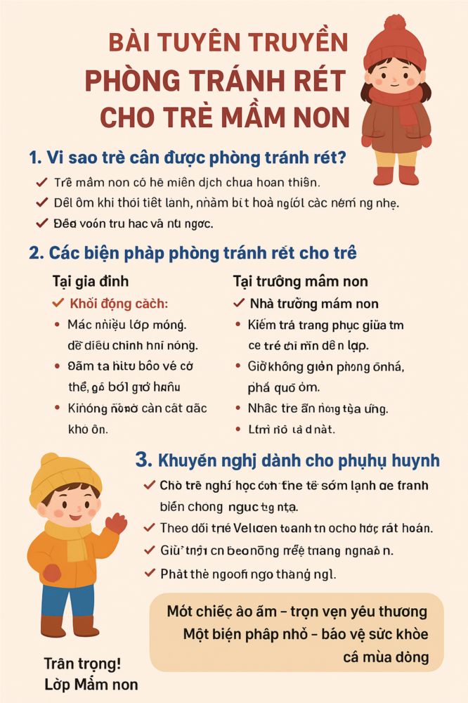 Thời tiết mùa đông đang đến gần, nhiệt độ giảm sâu có thể ảnh hưởng không nhỏ đến sức khỏe của trẻ nhỏ – đối tượng có đề kháng còn yếu và dễ mắc các bệnh liên quan đến hô hấp, cảm lạnh, viêm phổi, cúm… Vì vậy, việc giữ ấm và phòng tránh rét cho trẻ là nhiệm vụ vô cùng quan trọng, cần sự phối hợp chặt chẽ giữa gia đình và nhà trường.