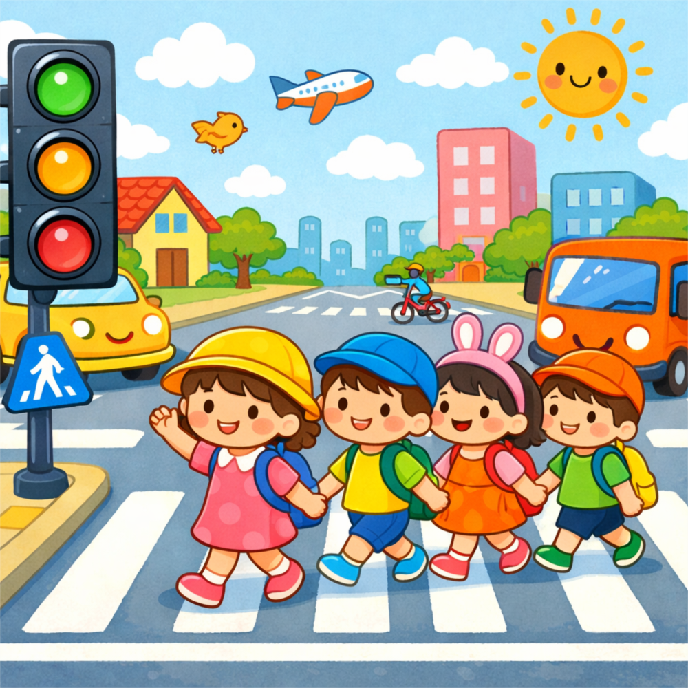 -> Giáo dục: Khi các con qua đường phải có người lớn dắt đi và các con phải nhớ nhìn biển tín hiệu đèn màu trước khi đi qua. Đèn xanh thì được đi còn đèn đỏ phải dừng lại.
